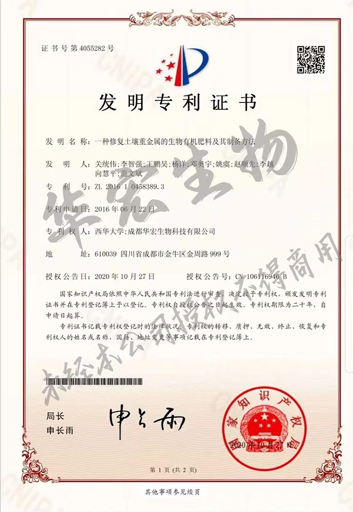 • 一種修復(fù)土壤重金屬的生物有機肥料及其制備方法專利證書